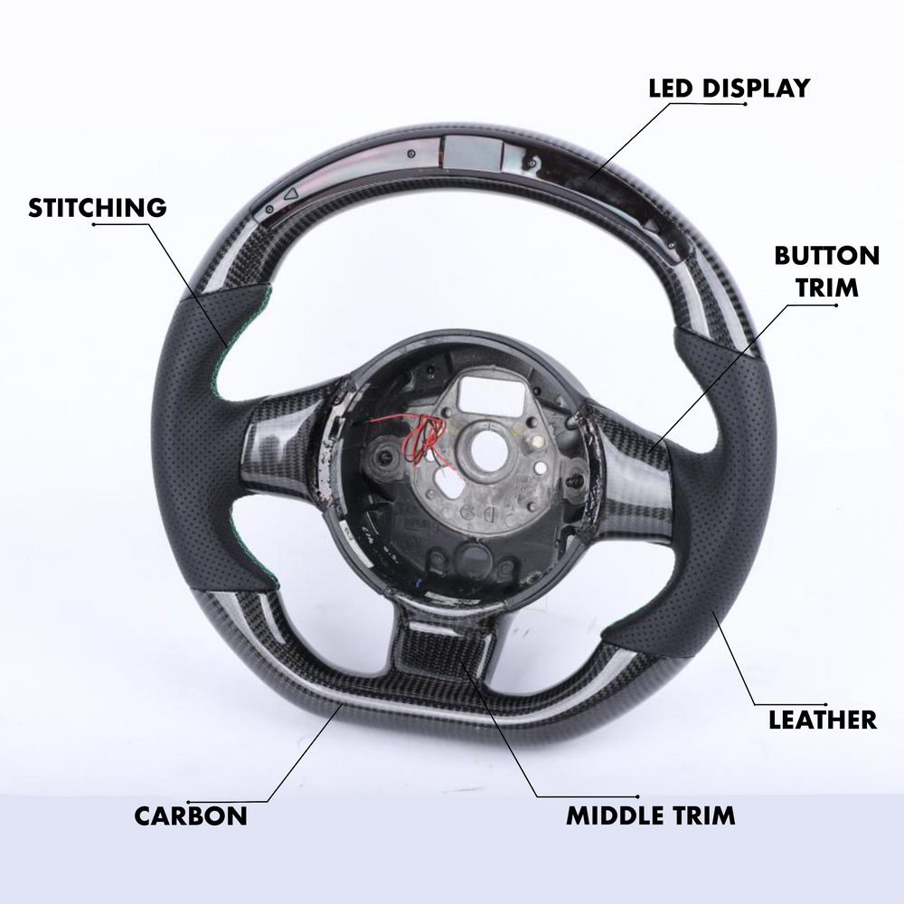 We offer a wide range of custom steering wheels for a variety of vehicles. From supercars to modern sport performance cars, we offer full custom steering wheels for the perfect fit, style, and performance. Our options include leather, alcantara, wood, and carbon fiber materials, along with custom stitching and accents. We also offer gloss, matte, and various carbon finishes, ensuring you get the perfect look for your desired ride.